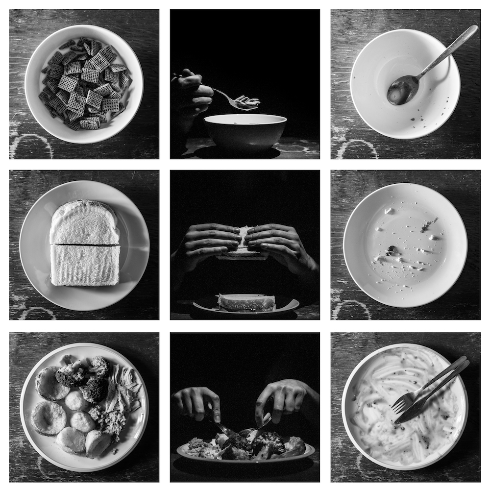 The title for this project is actually extremely smart, clever, needlessly complicated, and I'm very proud of it. You see, there are three triplets of square photos, depicting the "three square meals" of one's day, totalling nine images (the result of squaring the number three) which fit into a big square composition. I'll take my Nobel Prize now.